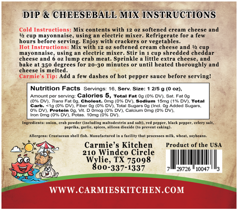 Bring the taste of the coast to your kitchen with our Crab Dip Mix! Made with real crab and a savory blend of seasonings, this easy-to-prepare mix creates a rich, creamy dip that’s perfect for any occasion. Just mix with softened cream cheese and mayonnaise, chill, and serve with your favorite crackers or toasted bread. Whether you're hosting a party or enjoying a quiet night in, this dip is sure to impress with its authentic seafood flavor and smooth, satisfying texture.