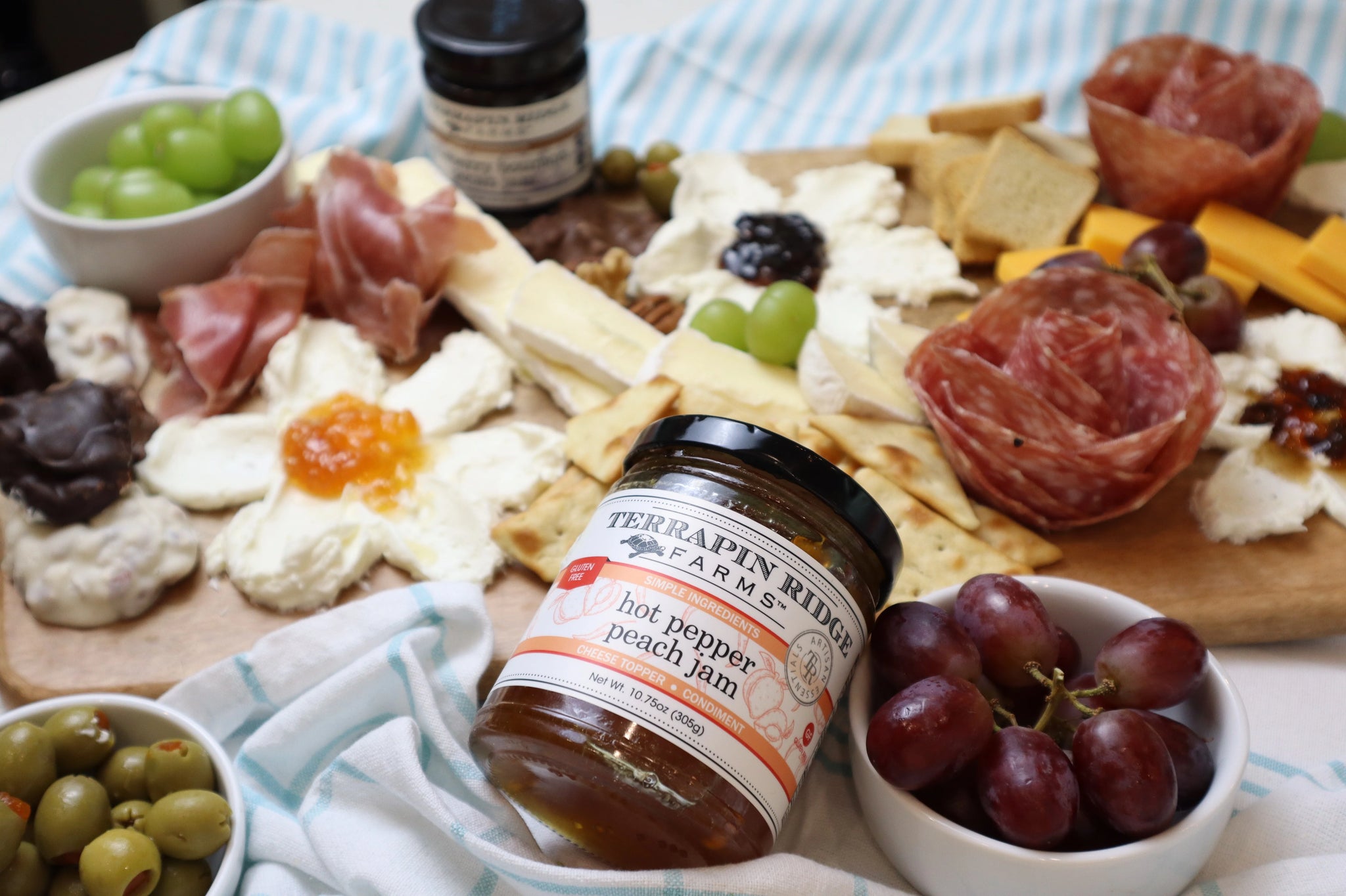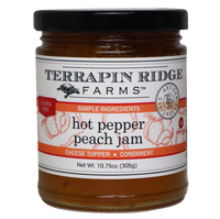 A perfect marriage of juicy peaches and mild heat make our Hot Pepper Peach Jam your go to jam for charcuterie, cheeseboards, and cheese balls. Smear on a crostini with ricotta cheese or on a cracker with goat cheese for a tasty snack. Excellent glaze for pork tenderloin, grilled pork chops and ham. Salmon will never be the same.
