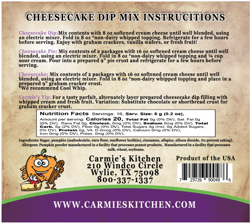 One of our most popular cheesecake dip mixes for a reason.  Made with all natural pumpkin and cinnamon, this flavor is super tasty and a fall classic.  Can be made into a cheesecake dip, cheesecake pie, and traditional cheesecake.  Just add this mix to cream cheese and cool whip to make this tasty treat.